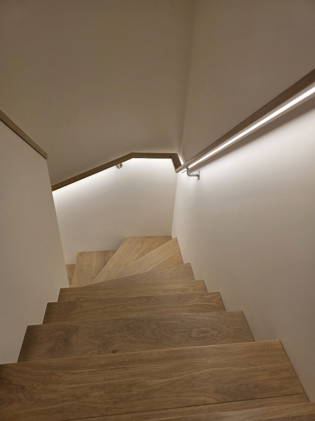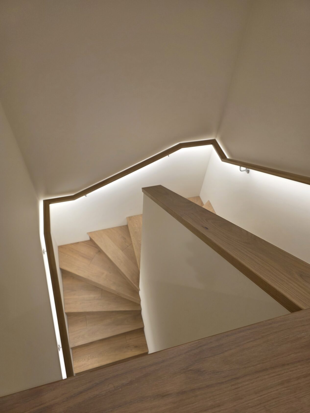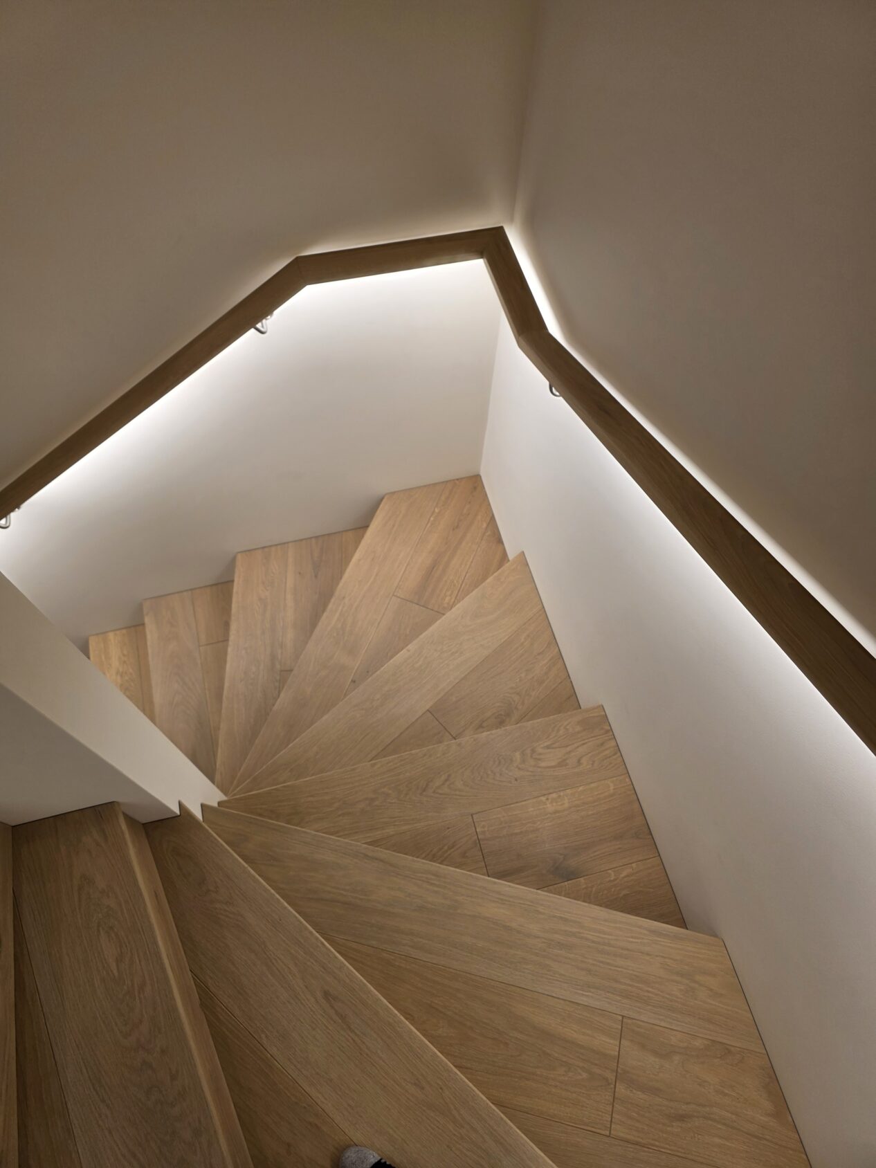 Ąžuolo laiptų pakopos ir porankis su led apšvietimu